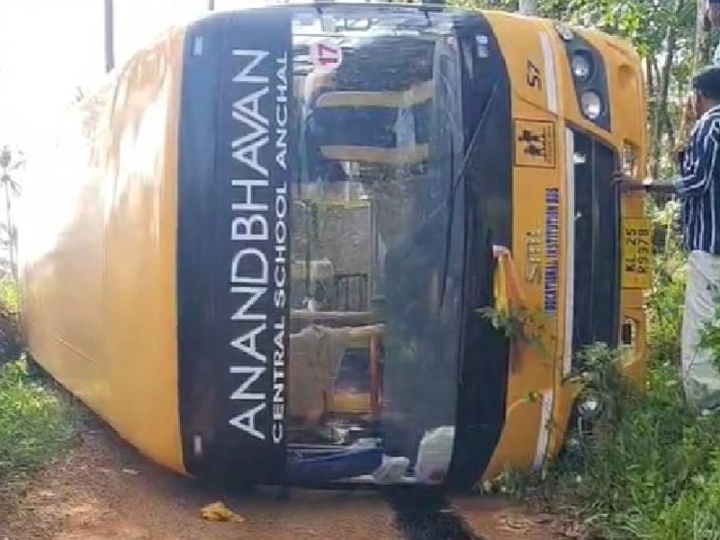 അഞ്ചല് ചൂരക്കുളത്തു പ്രവര്ത്തിക്കുന്ന ആനന്ദഭവന് സെന്റര് സ്കൂളിന്റെ ബസാണ് അപകടത്തില്പ്പെട്ടത്. റോഡിന്റെ വശത്ത് ഇട്ടിരുന്ന വലിയ മരക്കുറ്റിയില് തട്ടി ബസ് മറിയുകയായിരുന്നു.