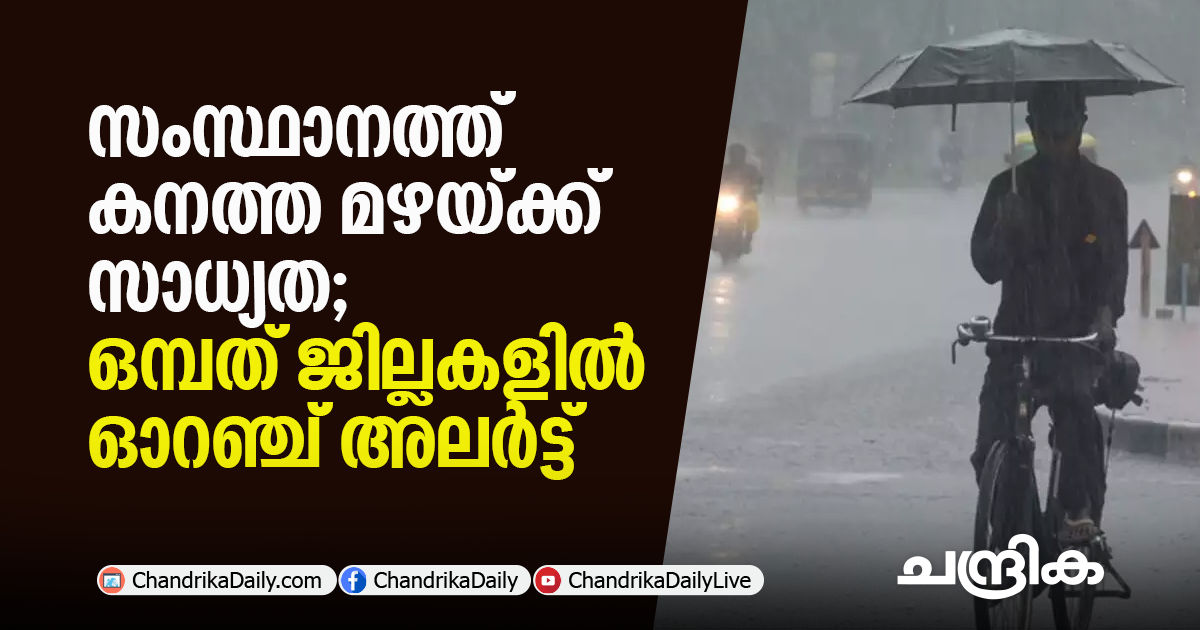 രണ്ടു ദിവസവും ഒമ്പതു ജില്ലകളില് ഓറഞ്ച് അലര്ട്ട് പ്രഖ്യാപിച്ചു. മറ്റന്നാള് വരെ വ്യാപക മഴ തുടരുമെന്നാണ് പ്രവചനം