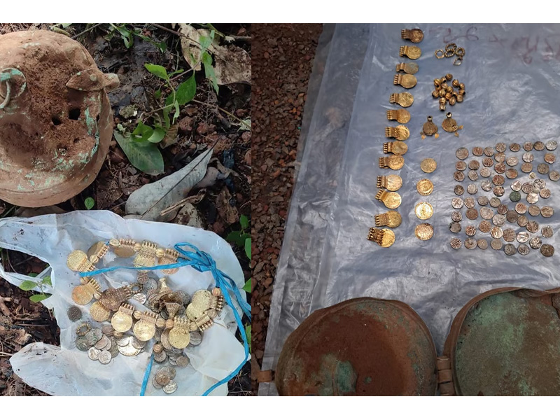 മഴക്കുഴി നിർമ്മിക്കുന്നതിനിടെ തൊഴിലുറപ്പ് തൊഴിലാളികൾ കണ്ടെത്തിയത് നിധി കുംഭം. ശ്രീകണ്ഠാപുരം നഗരസഭയിലെ ചെങ്ങളായി പരിപ്പായി ഗവ. യു.പി സ്കൂളിന് സമീപത്തു നിന്നാണ് പതിറ്റാണ്ടുകൾ പഴക്കമുള്ള സ്വർണം, വെള്ളി ആഭരണങ്ങളും നാണയങ്ങളും കണ്ടെത്തിയത്.