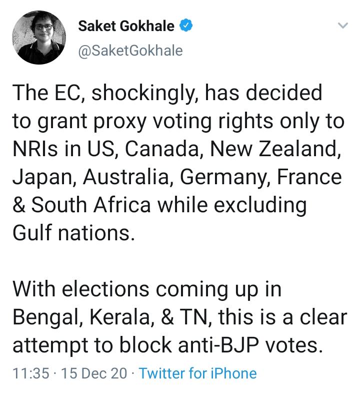 ബംഗാള്‍, കേരളം, തമിഴ്‌നാട് എന്നീ സംസ്ഥാനങ്ങളിലാണ് അടുത്ത വര്‍ഷം നിയമസഭാ തെരഞ്ഞെടുപ്പ് നടക്കാനിരിക്കുന്നത്. ഇതില്‍ കേരളമൊഴികെയുള്ള സംസ്ഥാനങ്ങളില്‍ ബിജെപി നിര്‍ണായക മുന്നേറ്റം നടത്താനാവുമെന്ന പ്രതീക്ഷയിലാണ്. ഗള്‍ഫ് പ്രവാസികള്‍ക്ക് വോട്ടവകാശം നല്‍കിയാല്‍ അത് തങ്ങള്‍ക്ക് എതിരാവുമെന്ന ഭയം കേന്ദ്രസര്‍ക്കാറിനുണ്ട്. ഇത് മുന്‍കൂട്ടി കണ്ടാണ് ഗള്‍ഫ് പ്രവാസികള്‍ക്ക് വോട്ടവകാശം നല്‍കാതിരിക്കുന്നത്.
