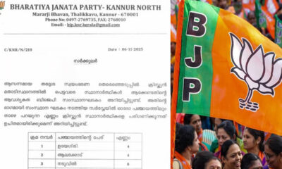 kerala3 days agoതദ്ദേശ തെരഞ്ഞെടുപ്പിൽ മതം നോക്കി സ്ഥാനാർഥികളെ നിർത്താൻ ബിജെപി